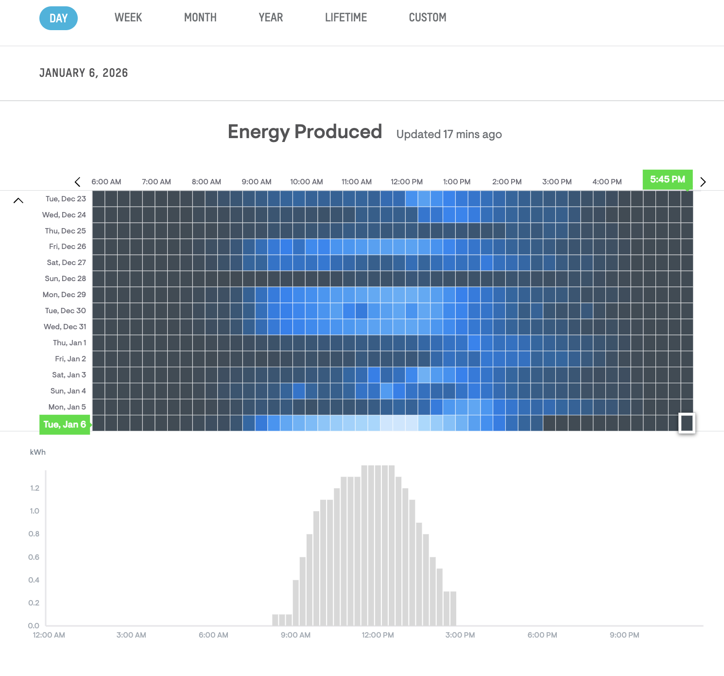 - 2026-01-06: 40.43 kWh total, peak hour: 6.8 kWh at 1:00 PM